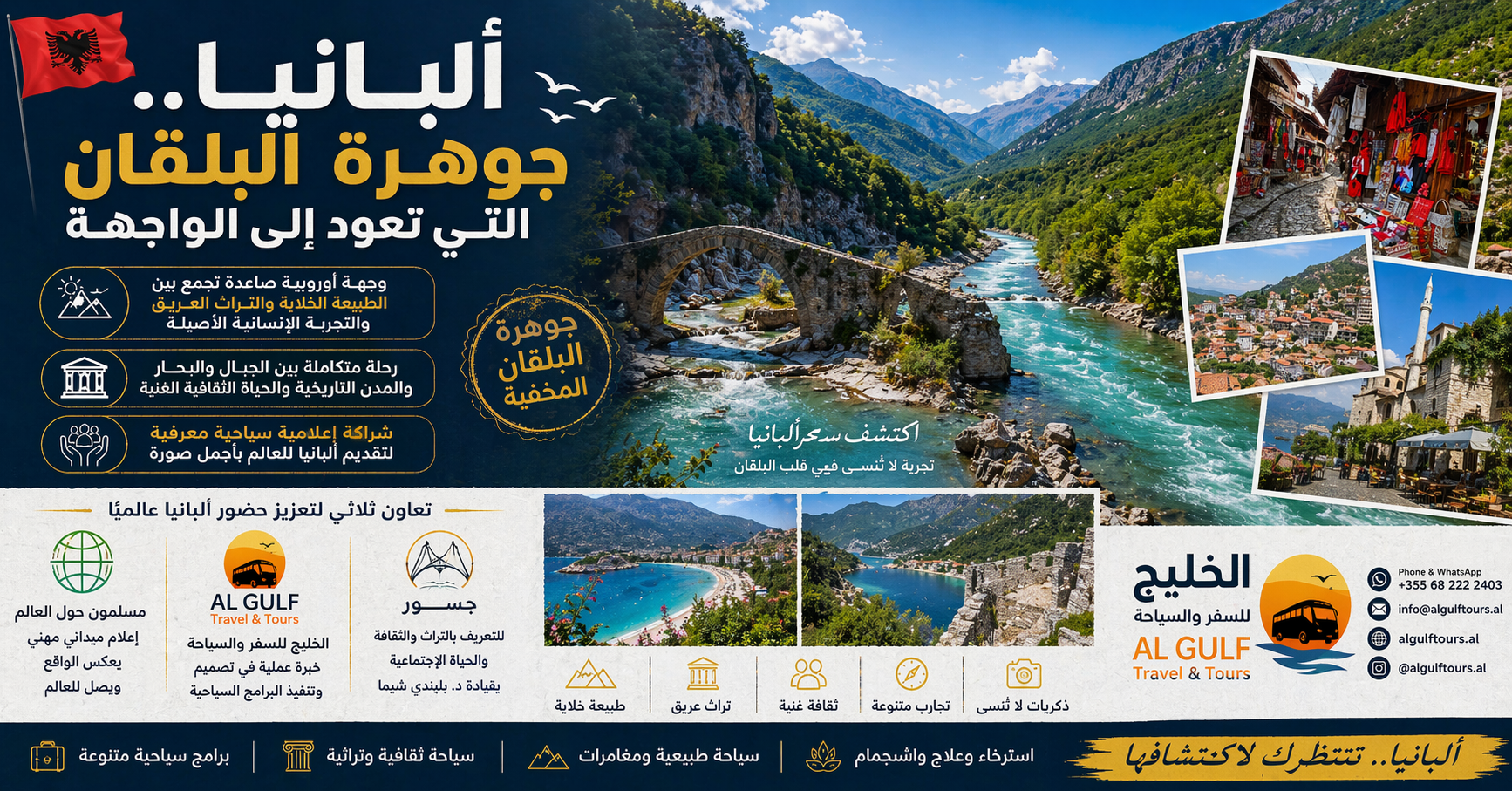 تقدم شركة الخليج للسفر والسياحة برامج سياحية متنوعة في ألبانيا وغرب البلقان، تشمل السياحة الثقافية والتراثية، والسياحة الطبيعية، والسياحة العلاجية والاسترخائية، وبرامج المغامرات، مع مسارات مصممة بعناية لتناسب مختلف الفئات والاهتمامات.