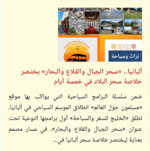 ولهذا، لا يغادر الزائر ألبانيا إلا وهو يحمل ذكريات جميلة وتجربة مميزة تدفعه للعودة مرة أخرى، وهو ما جعل الشركة تحظى بمحبة واحترام كل من تعامل معها.
