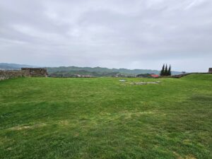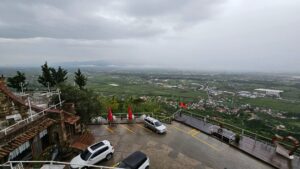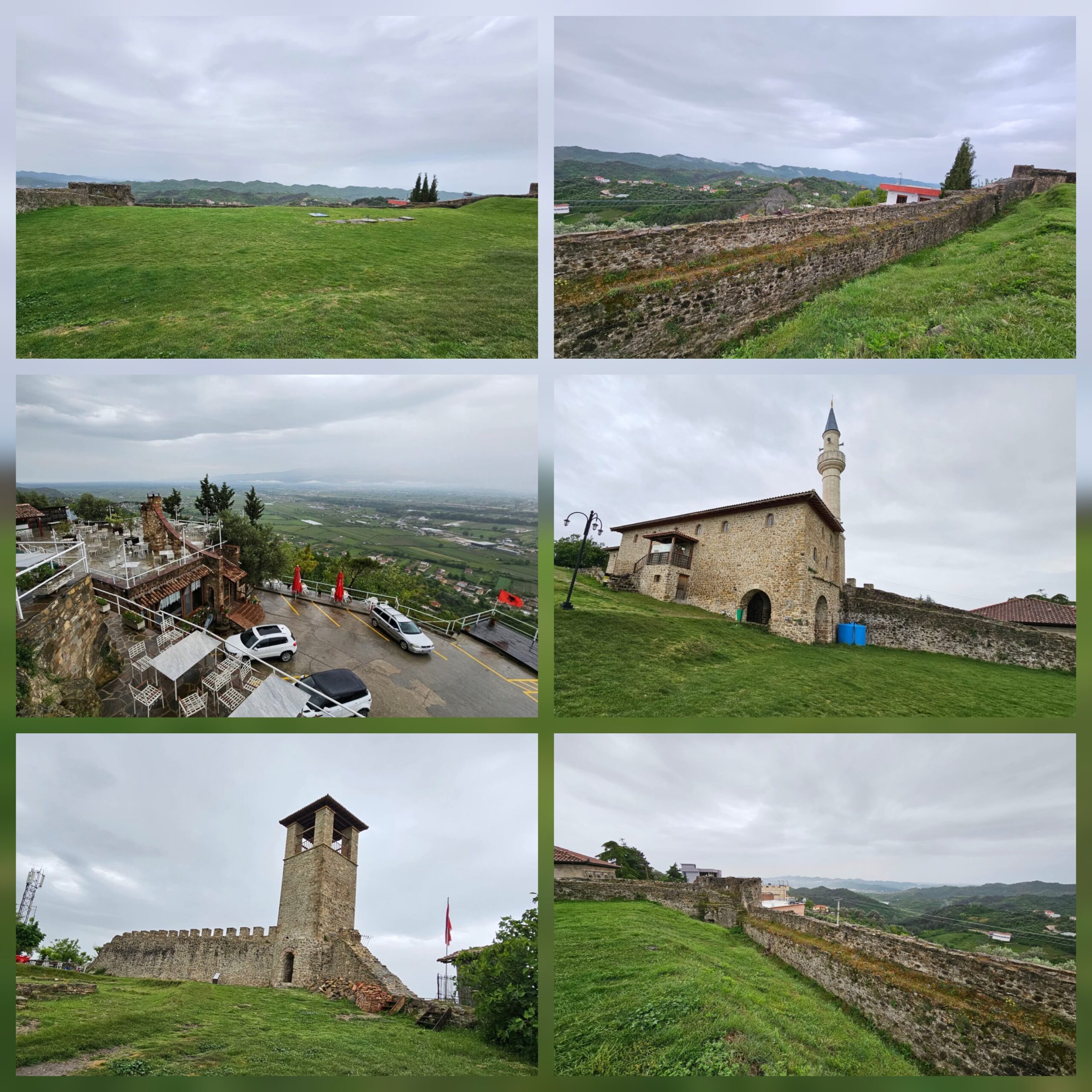 وتتوزع داخل القلعة مساحات خضراء واسعة محاطة بأسوار حجرية قديمة، بينما تنحدر التلال من حولها بشكل واضح، لتكشف في الأسفل مشهدًا مفتوحًا من السهول والمزارع والقرى، وصولًا إلى مطار تيرانا الذي يظهر في الأفق، في صورة تجمع بين الطبيعة والحياة المعاصرة في تناغم فريد.