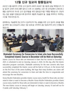 ضمن الخطة التعليمية المنتظمة، أعلن الاتحاد أن الدورة الجديدة لشهر يناير 2026 ستنطلق يوم السبت 10 يناير، وتستمر حتى 7 فبراير 2026، في إطار سياسة تعليمية شهرية ثابتة تستجيب للاهتمام المتزايد بالإسلام داخل المجتمع الكوري.