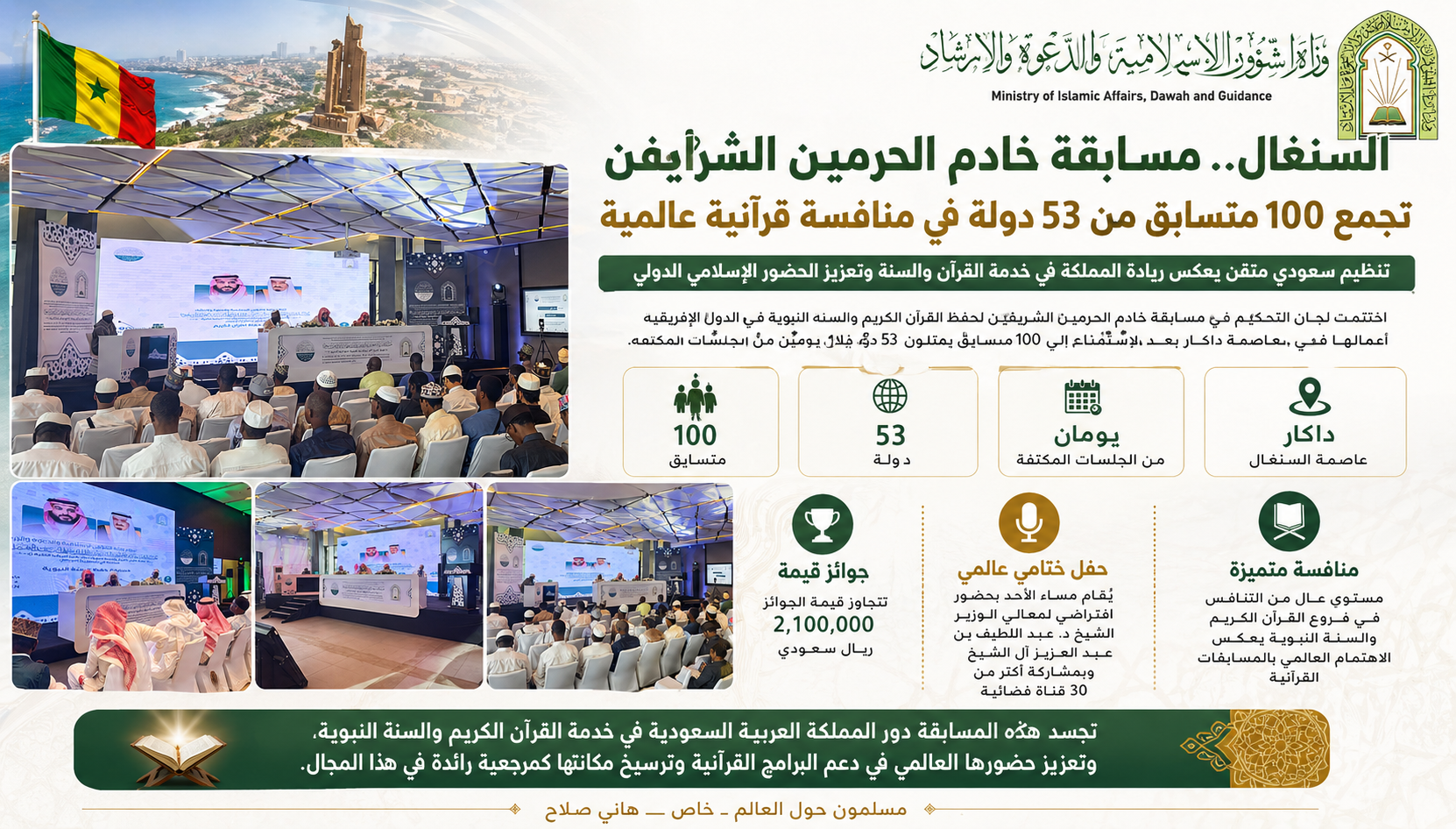 في مشهد يعكس الحضور العالمي للمبادرات القرآنية السعودية، اختتمت لجان التحكيم في مسابقة خادم الحرمين الشريفين لحفظ القرآن الكريم والسنة النبوية في الدول الإفريقية أعمالها في العاصمة داكار، الواقعة غرب السنغال على ساحل المحيط الأطلسي، بعد الاستماع إلى 100 متسابق يمثلون 53 دولة، ضمن جلسات مكثفة استمرت يومين.