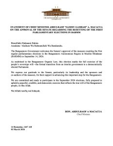 وفي بيان رسمي، أعرب رئيس برلمان بانجسامورو محمد إس. يعقوب عن تقديره لمجلس الشيوخ الفلبيني بعد إقراره مشروع القانون رقم 1823، الذي ينص على إعادة تحديد موعد الانتخابات البرلمانية الأولى في الإقليم.