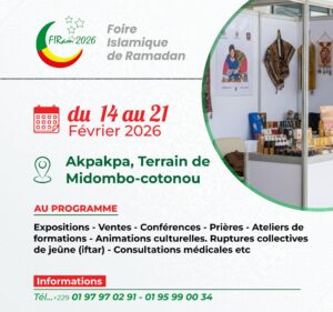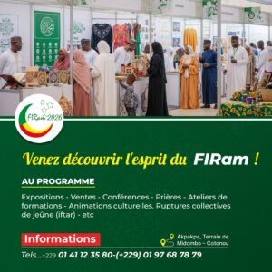 يُعد معرض «فِيرَام 2026» أحد أبرز الفعاليات الرمضانية في بنين، حيث يشكل منصة متكاملة تجمع بين البعد الديني والاقتصادي والاجتماعي، من خلال إتاحة الفرصة للعارضين ورواد الأعمال لعرض منتجاتهم وخدماتهم، لا سيما في مجالات المنتجات الحلال والأنشطة المرتبطة بشهر رمضان. ويستهدف المعرض استقطاب آلاف الزوار، بما يتيح للمشاركين تعزيز حضورهم التجاري والتواصل المباشر مع جمهور واسع وملتزم.