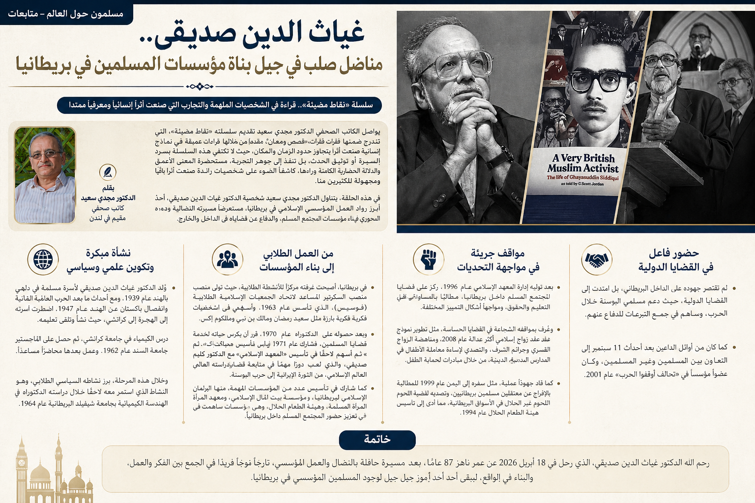رحم الله الدكتور غياث الدين صديقي، الذي رحل في 18 أبريل 2026 عن عمر ناهز 87 عامًا، بعد مسيرة حافلة بالنضال والعمل المؤسسي، تاركًا نموذجًا فريدًا في الجمع بين الفكر والعمل، وبين الشجاعة في الموقف والبناء في الواقع، ليبقى أحد أبرز رموز جيل أسس لوجود المسلمين المؤسسي في بريطانيا.