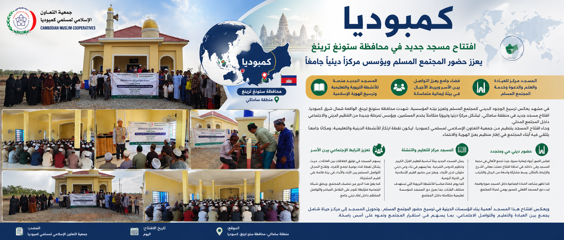 في مشهد يعكس ترسيخ الوجود الديني للمجتمع المسلم وتعزيز بنيته المؤسسية، شهدت محافظة ستونغ ترينغ، الواقعة شمال شرق كمبوديا، افتتاح مسجد جديد في منطقة ساماكي، ليشكل مركزًا دينيًا وتربويًا متكاملًا يخدم المسلمين، ويؤسس لمرحلة جديدة من التنظيم الديني والاجتماعي داخل المجتمع المحلي.