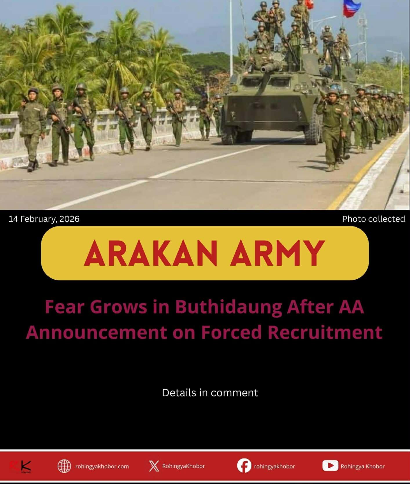 تشهد مناطق مسلمي الروهينجا في ولاية أراكان، الواقعة في غرب ميانمار (بورما سابقًا) على الحدود مع بنغلاديش، حالة متصاعدة من الخوف والتوتر، عقب إعلان صادر عن جيش أراكان بتاريخ 9 فبراير 2026 بشأن إدراج أبناء مسلمي الروهينجا ضمن قوائم التجنيد، بما يشمل فئات عمرية واسعة من الفتيان والفتيات، وفقًا لما أفاد به سكان محليون.
